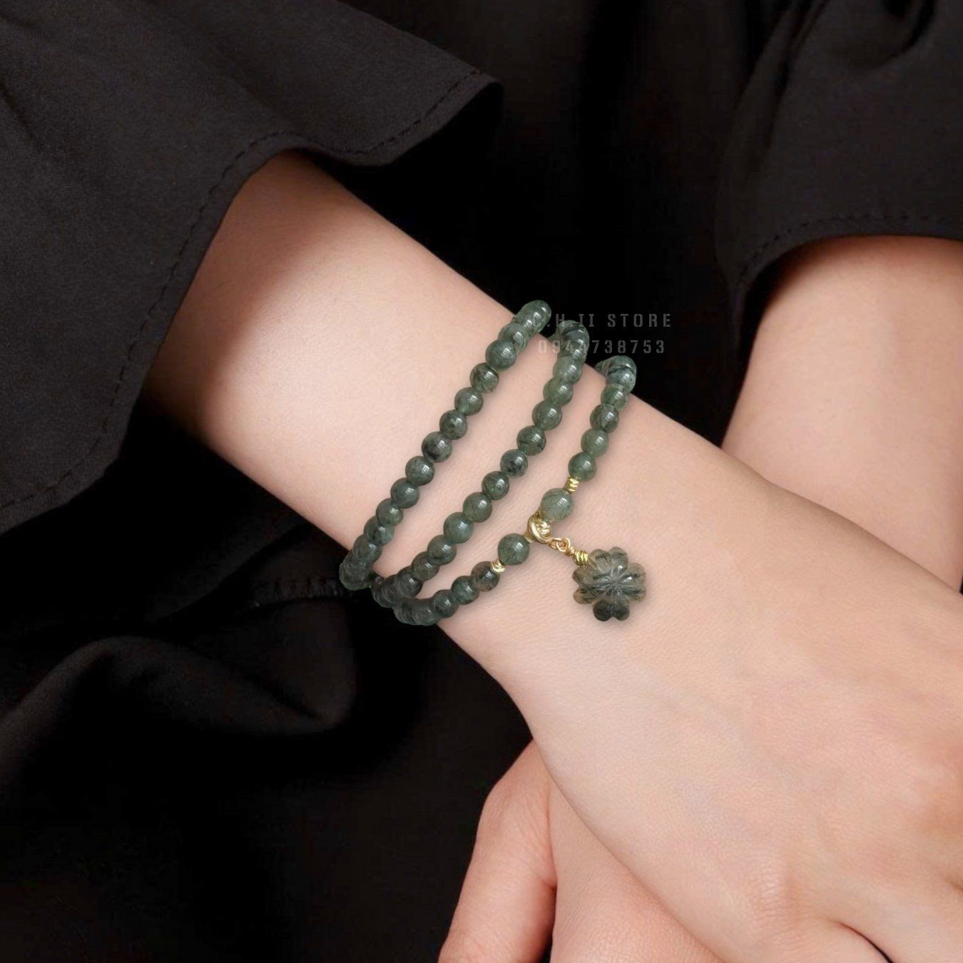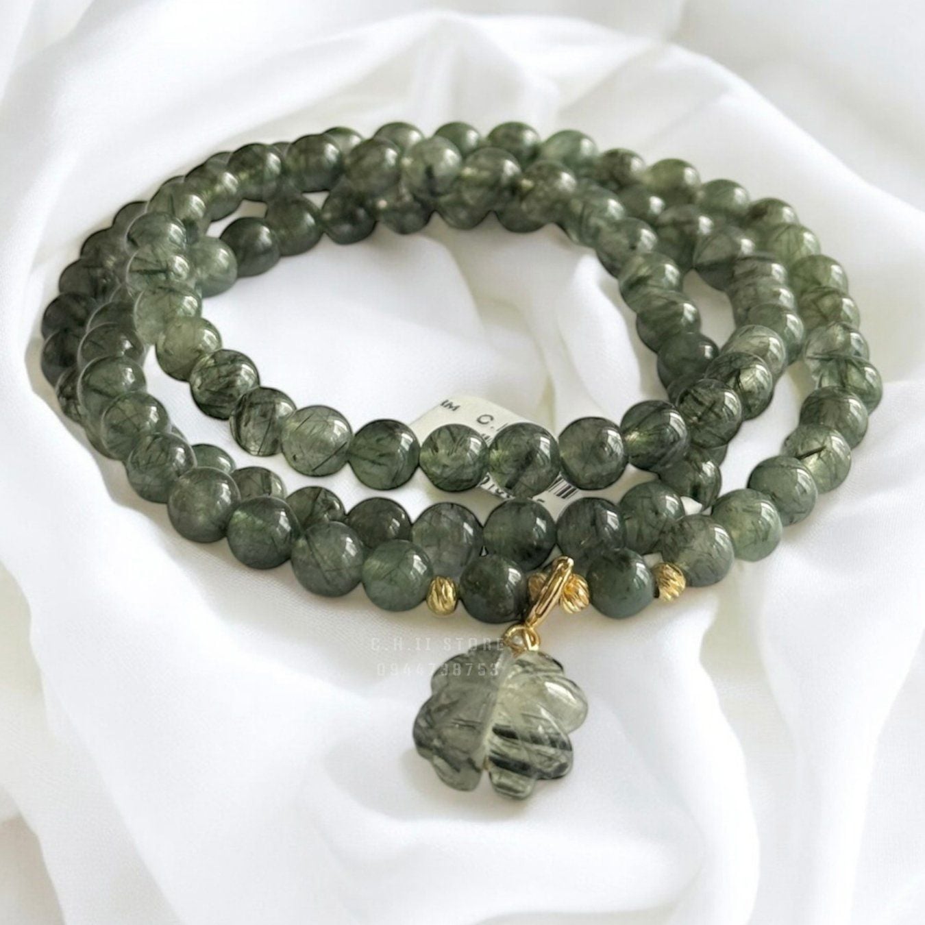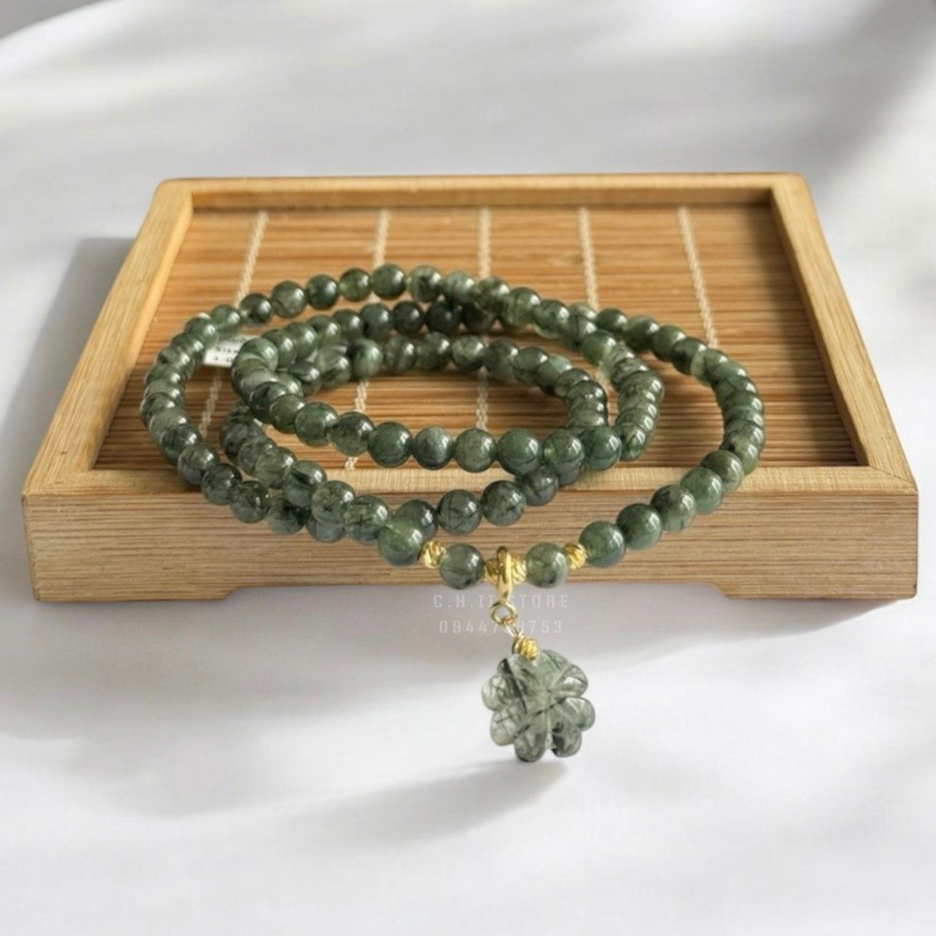 Chuỗi thạch anh tóc xanh Mix charm cỏ 4 lá