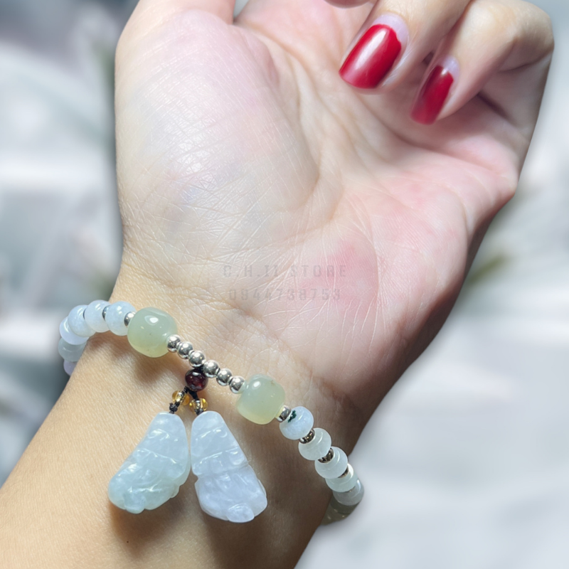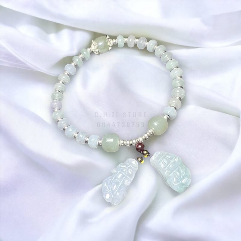 Vòng đá cẩm thạch jade + ngọc hòa điền mix bạc 925 và charm tỳ hưu