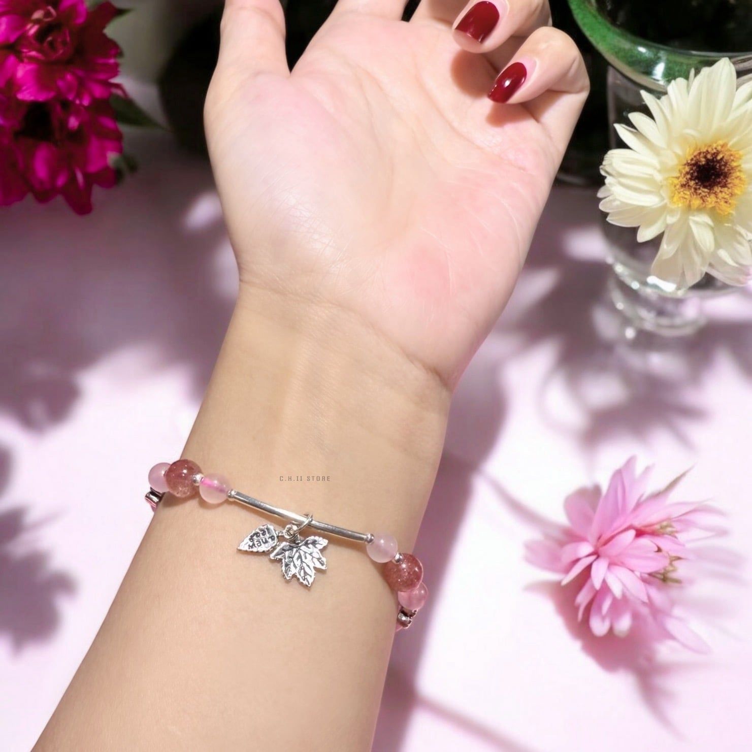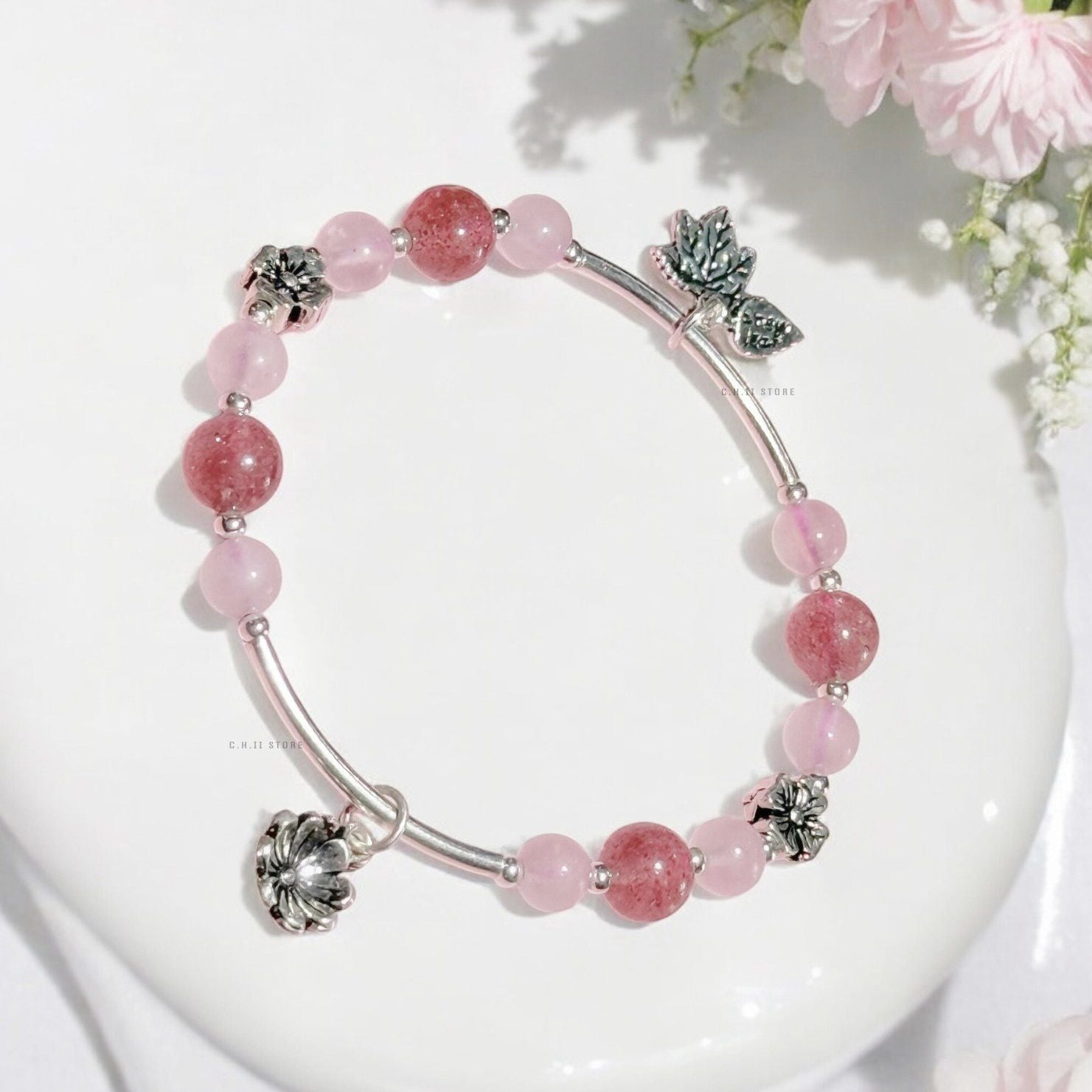 Vòng đá thạch anh hồng và thạch anh dâu tây hồng mix bạc 925
